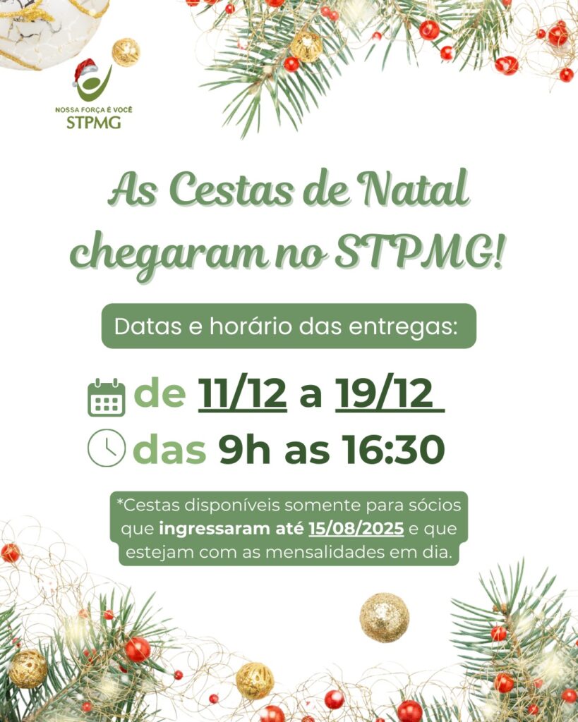 ✅ A cesta será concedida a associados ativos e registrados no STPMG que tenham efetuado sua associação até o dia 18 de agosto de 2025 e que estejam com as mensalidades em dia;