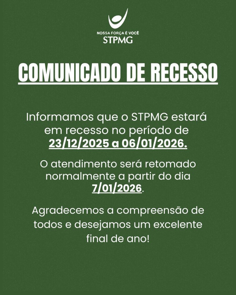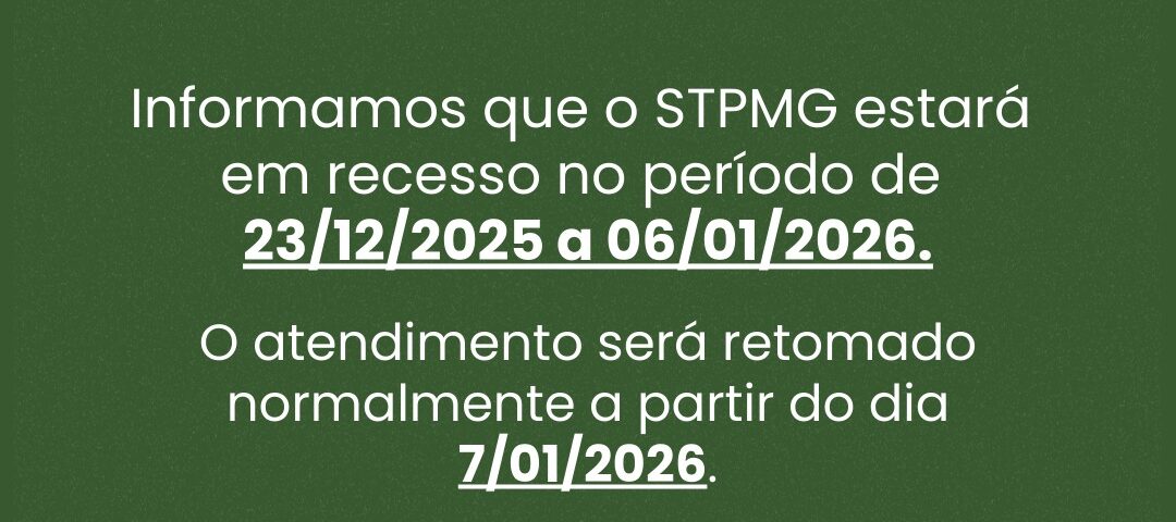 Informamos que o STPMG estará em recesso no período de 23/12/2025 a 06/01/2026, com retorno do atendimento normal a partir do dia 07/01/2026.
