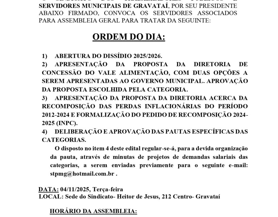 📢 ATENÇÃO, SERVIDORES MUNICIPAIS DE GRAVATAÍ! 📢 O STPMG convoca a categoria para a Assembleia Geral com pautas cruciais para […]