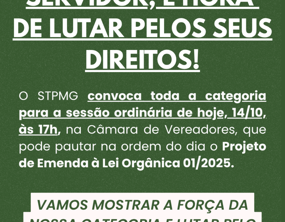 SERVIDOR, É HORA DE AGIR!! 📢 O STPMG convoca toda a categoria para a sessão ordinária da Câmara de Vereadores, […]
