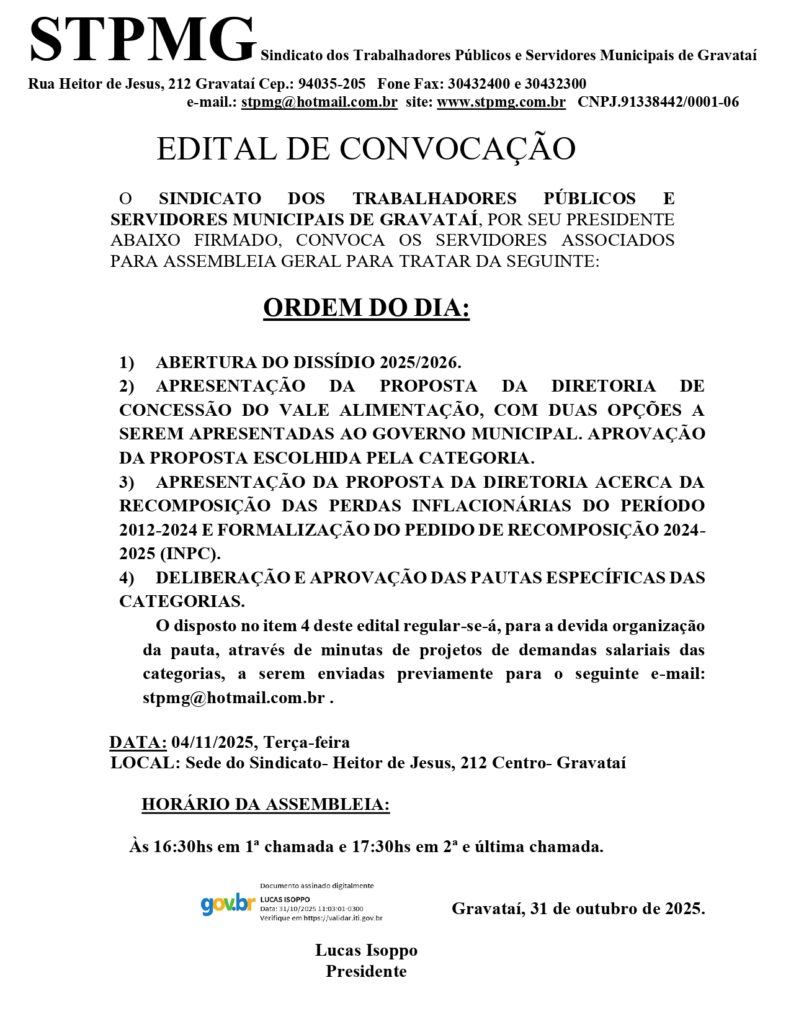 📢 ATENÇÃO, SERVIDORES MUNICIPAIS DE GRAVATAÍ! 📢 O STPMG convoca a categoria para a Assembleia Geral com pautas cruciais para […]