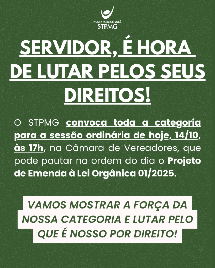 SERVIDOR, É HORA DE AGIR!! 📢 O STPMG convoca toda a categoria para a sessão ordinária da Câmara de Vereadores, […]
