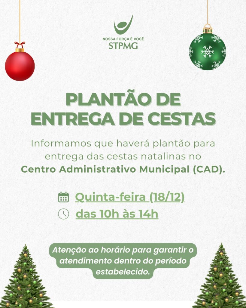O STPMG informa que haverá plantão para a entrega das cestas natalinas no Centro Administrativo Municipal (CAD). 📅 Quinta-feira, 18/12⏰ […]
