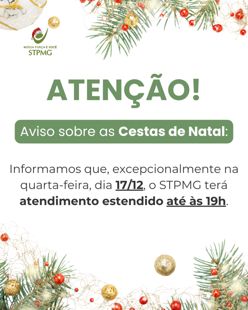 ⚠️ Atenção, associados! Excepcionalmente na quarta-feira, 17/12, o STPMG terá atendimento estendido das 9h às 19h para retirada das cestas […]